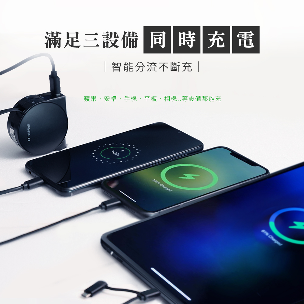 ● 滿足三設備同時充電(USB輸出孔+lightning充電線+Type-C/USB-A充電線)