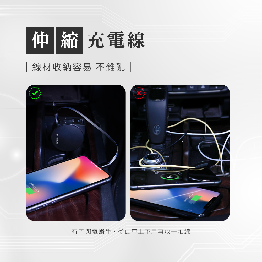 ● 伸縮充電線長度80公分,線材好用好收納,車上不用再放一堆線