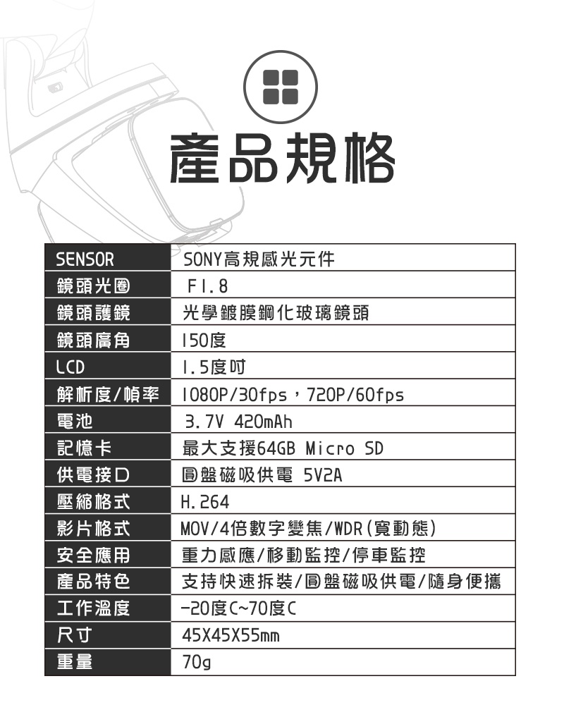 ● 解析度 / 幀率:1080P / 30FPS,720P / 60FPS