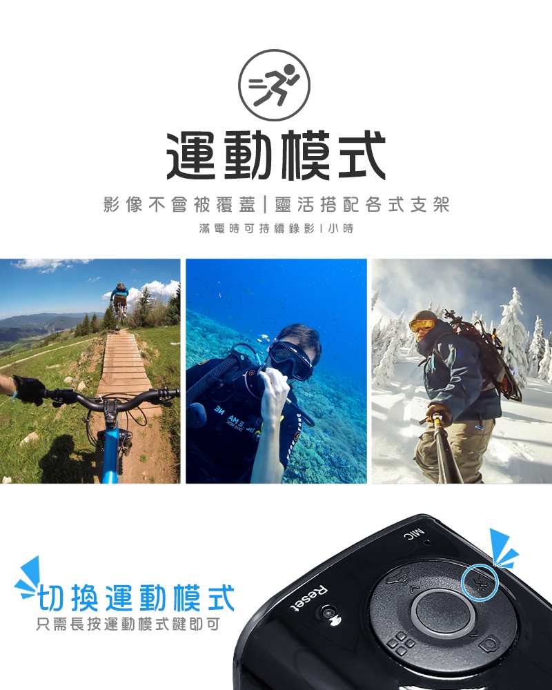 ● 可搭配各種專用外殼/自拍/水下攝影/機車/腳踏車/安全帽/辦公/蒐證/會議記錄