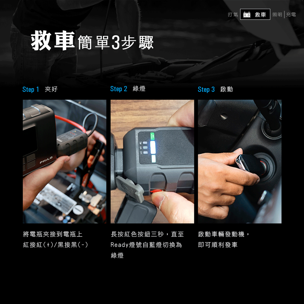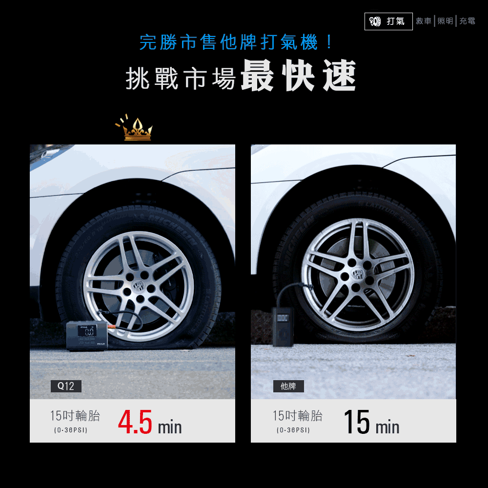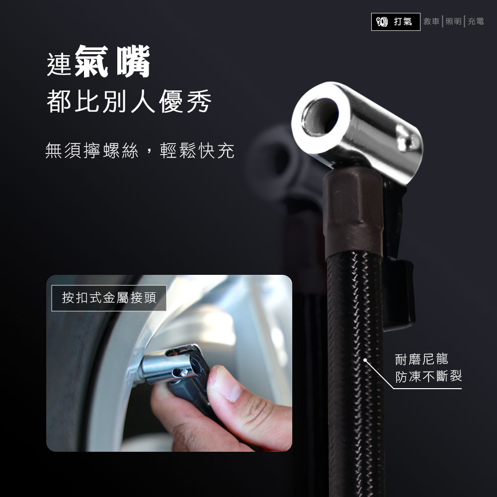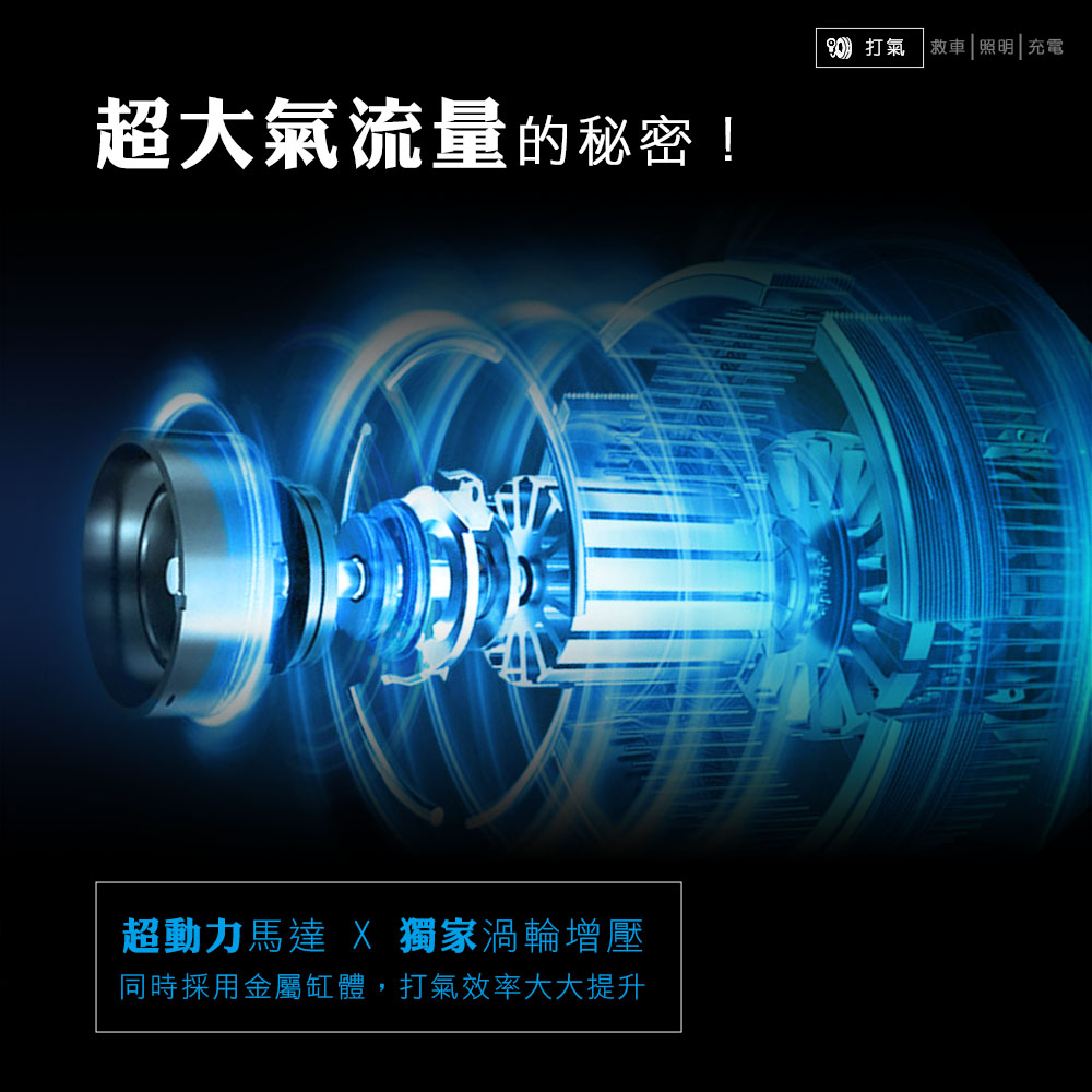 ● 4 IN 1 救車X打氣X照明X充電,多種功能一機滿足