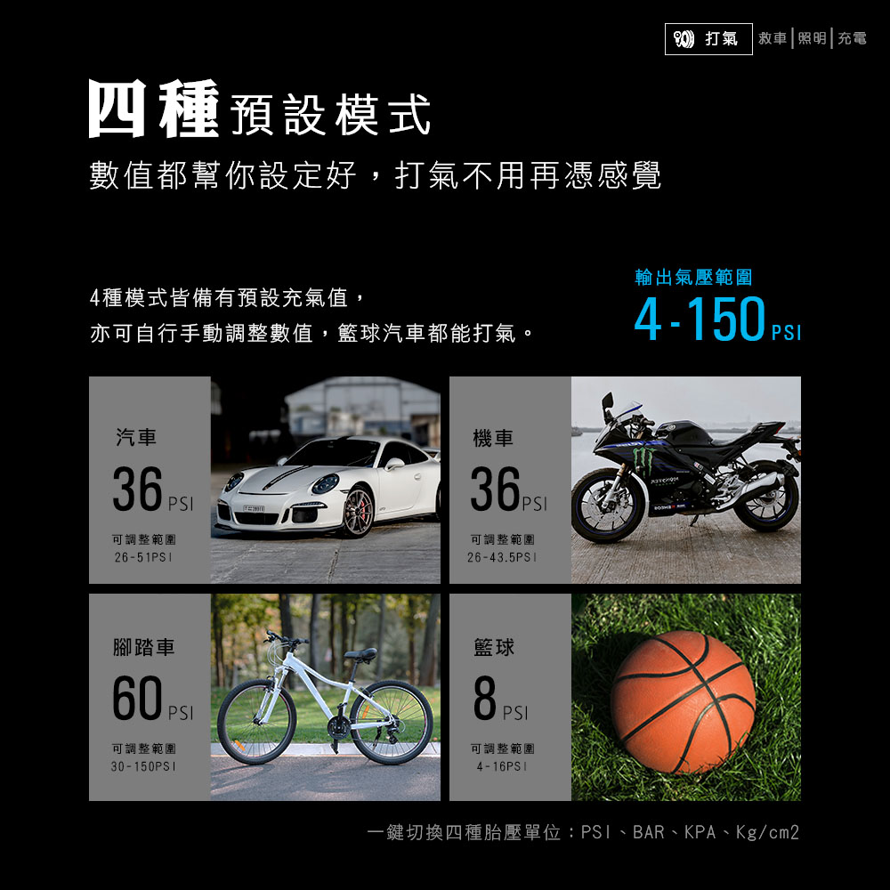 ● 四種預設模式,汽車/機車/腳踏車/籃球,最高可設置150PSI