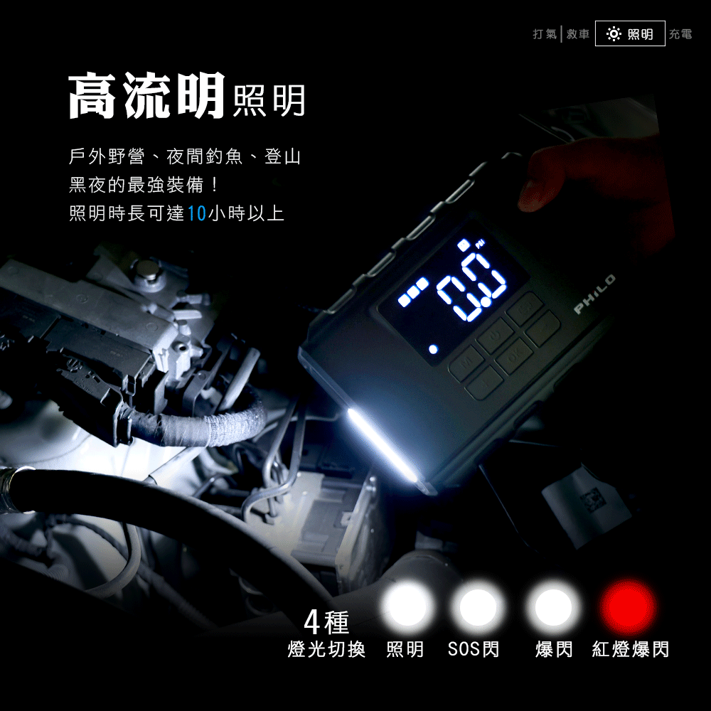 ● 四種高流明度LED照明模式,照明/SOS閃/爆閃/紅燈爆閃,夜間打氣救車一樣清楚