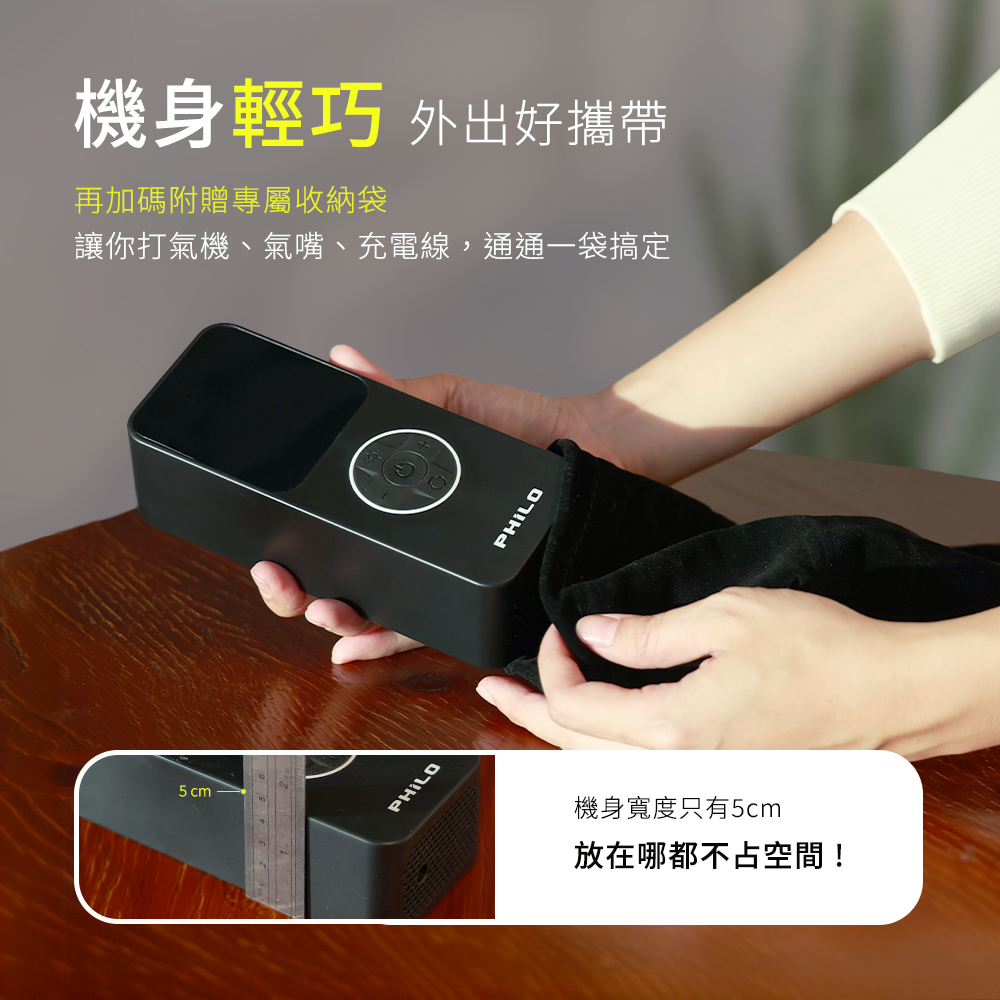●內置大容量5000mAh鋰電池,無線充氣最方便,滿電狀態下約可打2.5條15吋汽車空胎