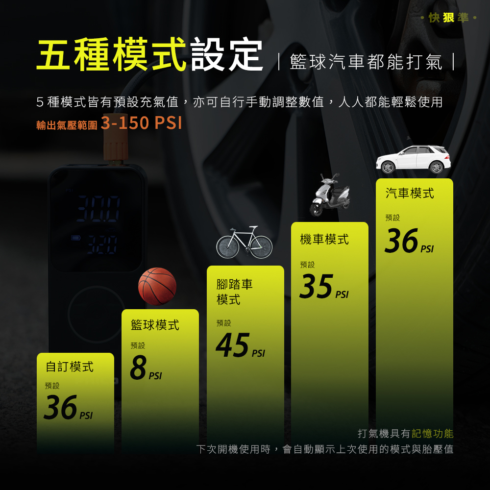 ●五種預設模式,汽車/機車/腳踏車/籃球/自訂,最高可設置150PSI