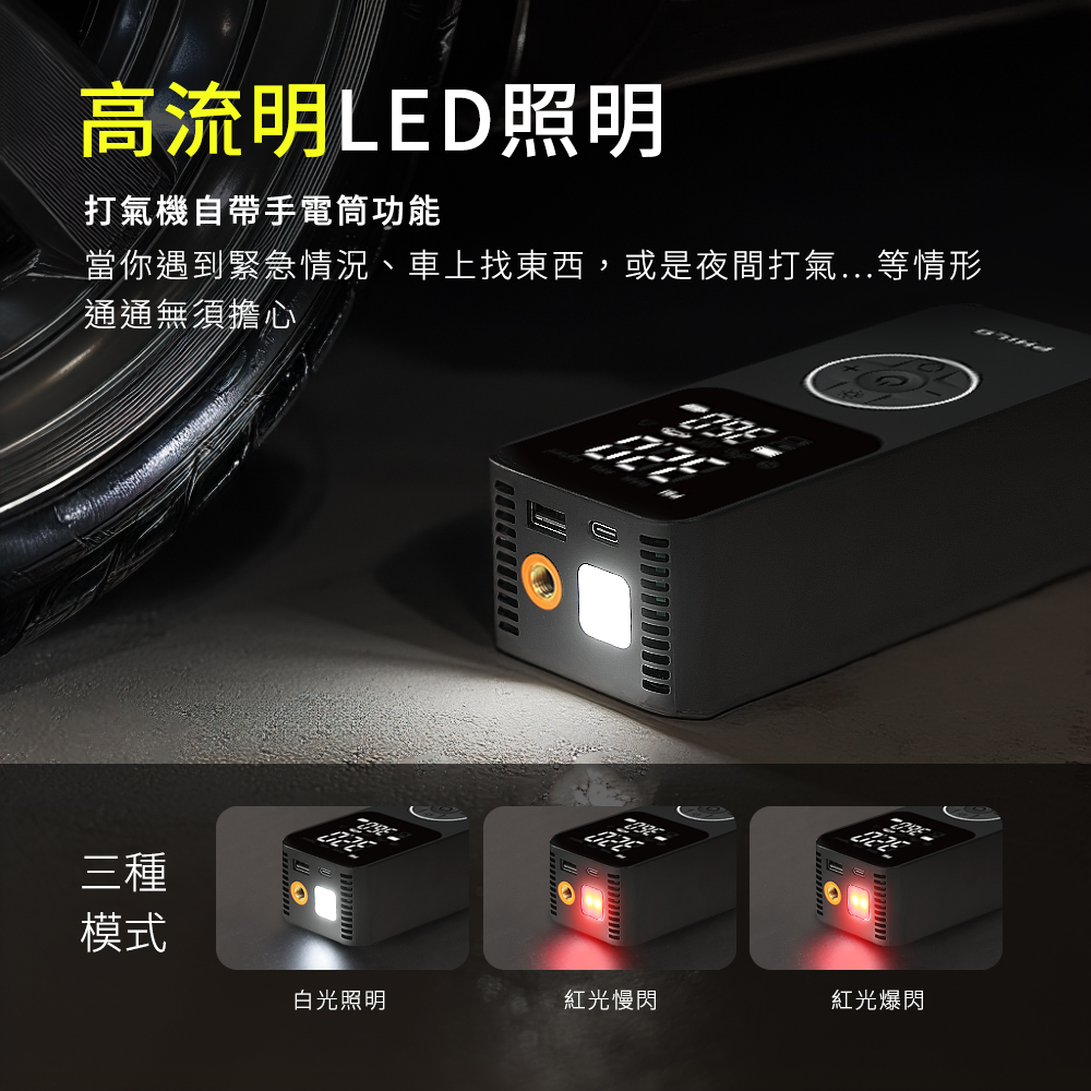 ●三種LED照明模式,白光照明/紅光慢閃/紅光爆閃,夜間打氣一樣清楚