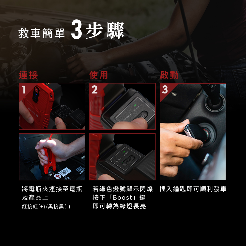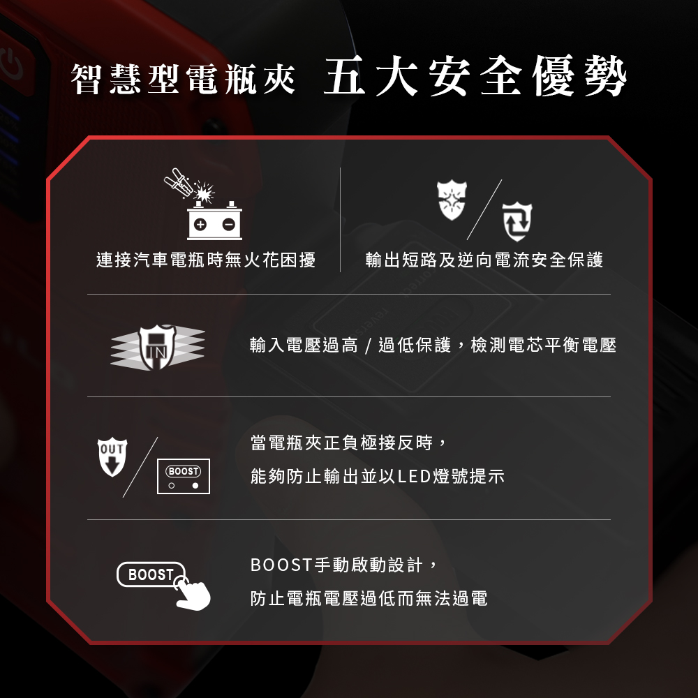 ●使用3PIN智慧型電瓶夾,具有溫度保護、電壓平衡、傳導強化,三重保護