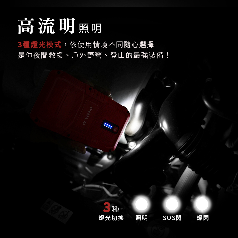 ●三種高流明度LED照明模式,照明/爆閃/SOS閃,夜間救車一樣清楚