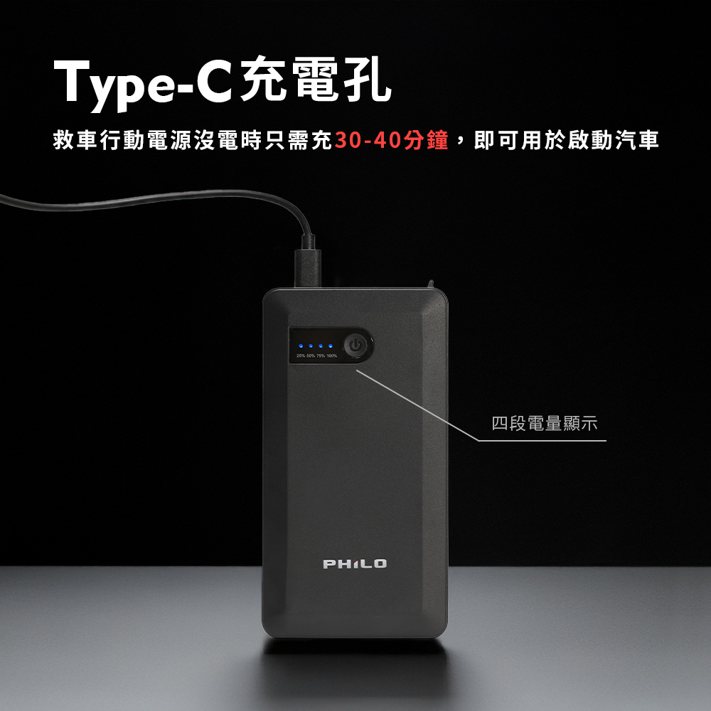●Type-C輸入充電孔,充30~40分鐘的電量即可用於救車