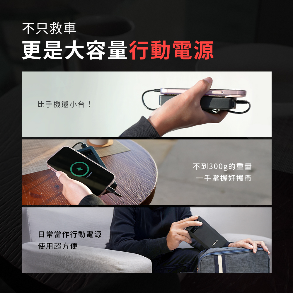 ●重量不到300公克,大小比手機還小,日常當作大容量行動電源使用超方便
