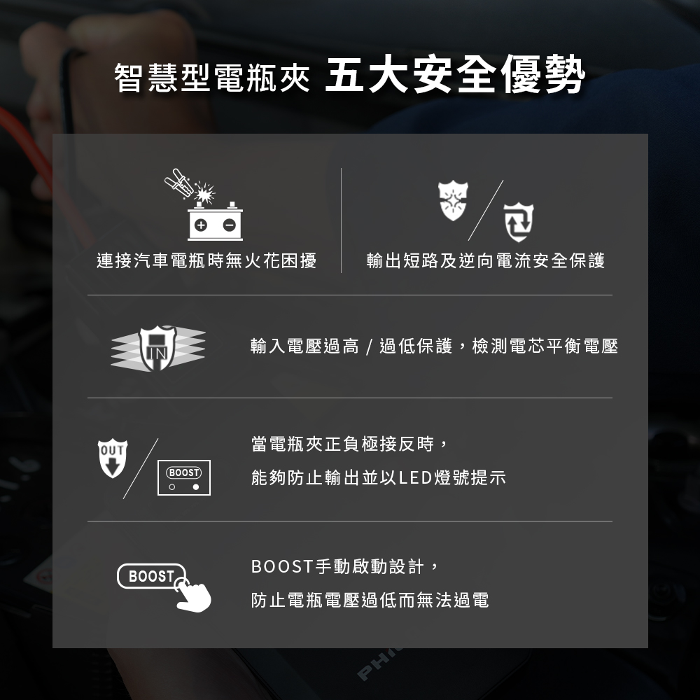 ●使用3PIN智慧型電瓶夾,具有溫度保護、電壓平衡、傳導強化,三重保護