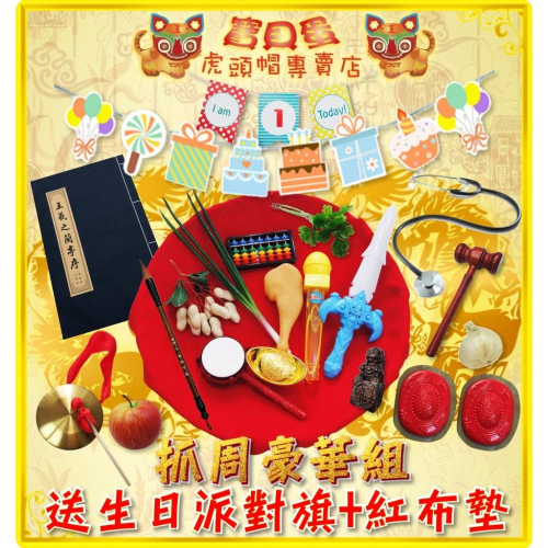 抓周 抓週 寶貝蛋虎頭帽專賣店 抓周傳統古代道具18件組合(A組)+一歲生日旗1款 送抓周紅布墊+派對佈置旗1款~