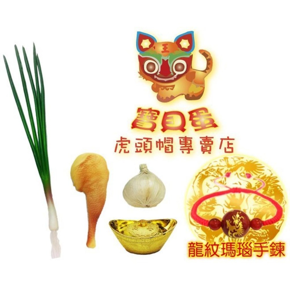 BSMI M3F375 使用方法:僅供兒童抓周拍照時做為道具使用。 《寶貝蛋》抓周/抓週雞腿 蔥 蒜 金元寶/軟橡膠 雞腿/按壓會發出BB聲+瑪瑙龍珠手鍊(紅瑪瑙+精緻做工紅繩編金剛結) 5件組   雞腿長:約16cm 雞腿寬:約7cm 材質:軟橡膠內置哨子,按壓會發出BB聲   瑪瑙龍珠手鍊  [瑪瑙龍珠大小]: 1.38 cm(誤差+-1mm)[鍊圍最小長度]: 12cm(可伸縮)(適合1~3歲)珠面:金龍戲珠   【瑪瑙寓意】 1、瑪瑙是佛教七寶之一,自古以來一直被當為避邪物、護身符使用,象征友善的愛心和希望,有助於消除壓力、疲勞、濁氣等負性能量。 2、將適量的瑪瑙放置於枕頭下,有助於安穩睡眠,並帶來夜夜好夢。 3、傳統習俗讓小寶寶多接觸帶水瑪瑙,可以感染水的特性,具有聰明、靈活、乖巧、學習力強、環境適應力佳。     【紅繩寓意】傳統說法:小寶寶與兒童佩帶可以護體、趨吉避凶、消災免禍。傳統繫法亦有父母將單條紅繩繫在女寶寶與小女孩左腳上,作為避邪法寶。一條數尺長的紅繩經過巧手的綰、結、穿、纏、繞、編、抽等多種工藝技巧,瞬間演變成一個上下一致、左右對稱、正反相同、首尾可以互相銜接的完整造型,左右端加上金剛結的編法,有代表一生如意。 護身金剛結簡稱,金剛結藏語稱為「宋哇」,意思是「守衞保護」,相當於中文俗諺所說的「護身」(之物)。 在古書的詞句中,就曾有記載到:[交絲結龍鳳,鏤彩織雲霞,一寸同心縷,千年長命花。] 這些充分表達了中國紅繩文化的美好意蘊,每個花結都寄托著著中華民族千年來不變的美好願望:富足,長壽,平安,幸福,驅邪避禍,繩來運轉。它已經不再是一條普通的紅繩,也不再僅僅是一個裝飾,而是一個具有魔力的神聖祝福。 近幾年紅繩的流行,不僅是因為佩戴紅繩驅邪避禍、會帶來好運!   抓周又稱試兒、試周、拿周,是東方民族(台灣、中國、日本、韓國、新加坡、馬來西亞..等)對周歲時的小孩做人生首次性向測驗,預卜嬰兒前途的習俗。當新生兒周歲時,將各種物品擺放於小孩面前,任其抓取,傳統上常用物品有筆、墨、紙、硯、算盤、錢幣、書籍、雞腿、蔥、蒜等。抓週習俗在魏晉南北朝時期已存在,「江南風俗,兒生一期為制新衣,盥浴裝飾,男則用弓矢紙筆,女則用刀尺針縷,並加飲食之物及珍寶服玩,置之兒前,觀其發意所取,以驗貪廉智愚,名之為試兒。」現在也有些會放手機、小飛機、吹風機、聽筒等現代物品,有些會以圖卡或木雕品代替實物讓嬰兒抓取。   【抓周儀式】‧祭拜祖先,告訴祖先寶寶滿一歲的訊息,祈求寶寶能健康成長。‧祭拜後在神桌前準備一個米篩,裡面放入12~18項物品,建議有書、筆墨、印章、  算盤(計算   機)、  錢幣、雞腿、尺、蔥、蒜、 芹菜、稻草、刀劍、聽筒等。‧接著讓寶寶坐在米篩前,讓寶寶任意抓取以此預測寶寶將來會選擇的行業與命運。   「抓周」時擺的物品各有象徵意義:紙、筆、硯、書籍為儒生的兆頭;官帽、誥敕、印章等為出仕的兆頭;刀、劍、戈、矛等兵器為武夫的兆頭;金銀、珠寶等為富人的兆頭;算盤、升斗等為商人的兆頭;刀剪、針線、農具等為農工的兆頭。      抓週為討吉利都會用6的倍數,為六六大順的吉祥意思,因此抓週物品樣數應是6的倍數,如12或18。     民間傳說三歲以下的孩子眼睛是最乾淨雪亮的,他們能看到許多大人看不到的東西,對陰陽兩界的事物無法分辨,而且陰陽兩界的事物都會同時接觸,因此長輩會製作純陽的「虎頭帽」保護嬰幼兒。所以孩子們會穿著以虎頭所做的虎頭帽、虎頭鞋、虎頭枕與穿著五毒肚兜,可以令他們百邪不侵,趨吉避凶,遠離疾病,從頭福氣到底,健康快樂的成長。     傳說 『摸摸虎頭,吃穿不愁。摸摸虎嘴,驅邪避鬼。摸摸虎身,步步高升。摸摸虎背,榮華富貴。摸摸虎腳,十全十美。』   本店產品是依傳統特色繡工,做工細膩,樣式可愛、精美漂亮!虎頭帽、虎頭鞋經過十分複雜精細的製作,誇張的製作工藝表現,外表栩栩如生,其質量和做工都超越了一般帽子;可作為寶寶滿月、慶周歲或饋贈親朋好友的最佳禮物,值得收藏!   本產品由手工縫製敬請提前訂購,尺寸如遇缺貨時須提前半個月訂製。 ※可於[問與答]詢問是否有現貨 或 至【關於我】洽客服人員 ~ 張小姐