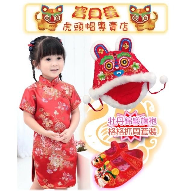 《寶貝蛋》手工毛萌虎虎頭帽+B款寶寶牡丹旗袍唐裝+福虎虎頭鞋套組/百天生日周歲~一次性商品