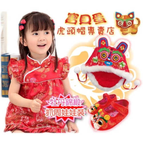 抓周 抓週 寶貝蛋 毛萌虎虎頭帽+改良寶寶牡丹旗袍唐裝+福虎虎頭鞋套組 周歲禮服娃娃裝~超漂亮 一次性商品