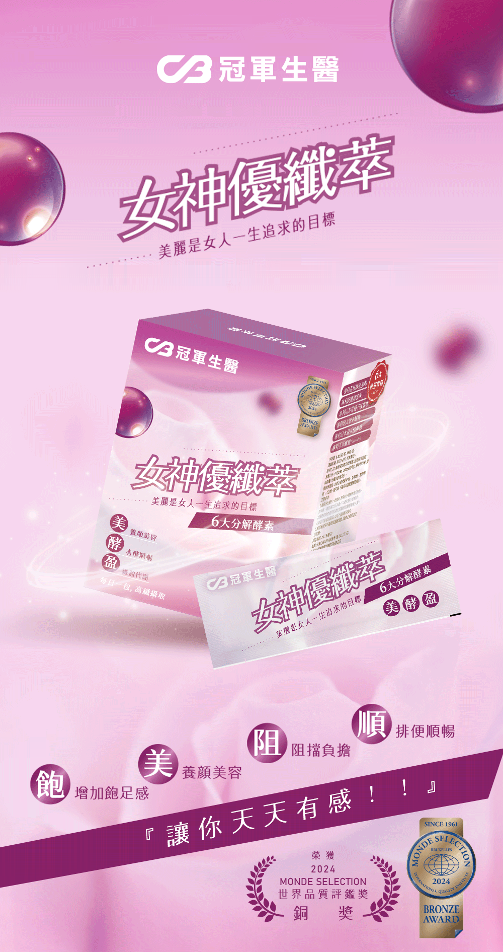 世界專利、有酵順暢、飽足、纖盈代謝、養顏美。