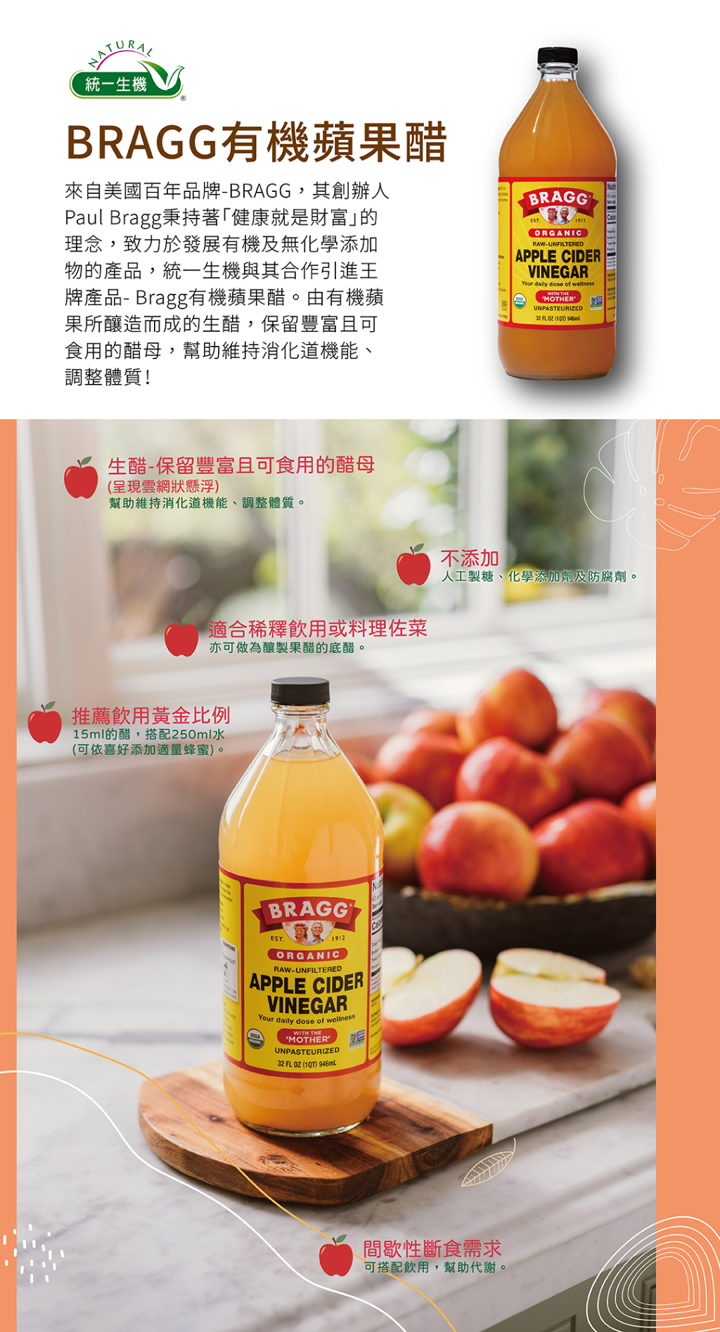 百年老號 Bragg’s 有機蘋果醋,冷榨、不經過濾的純天然蘋果醋富含維他命、