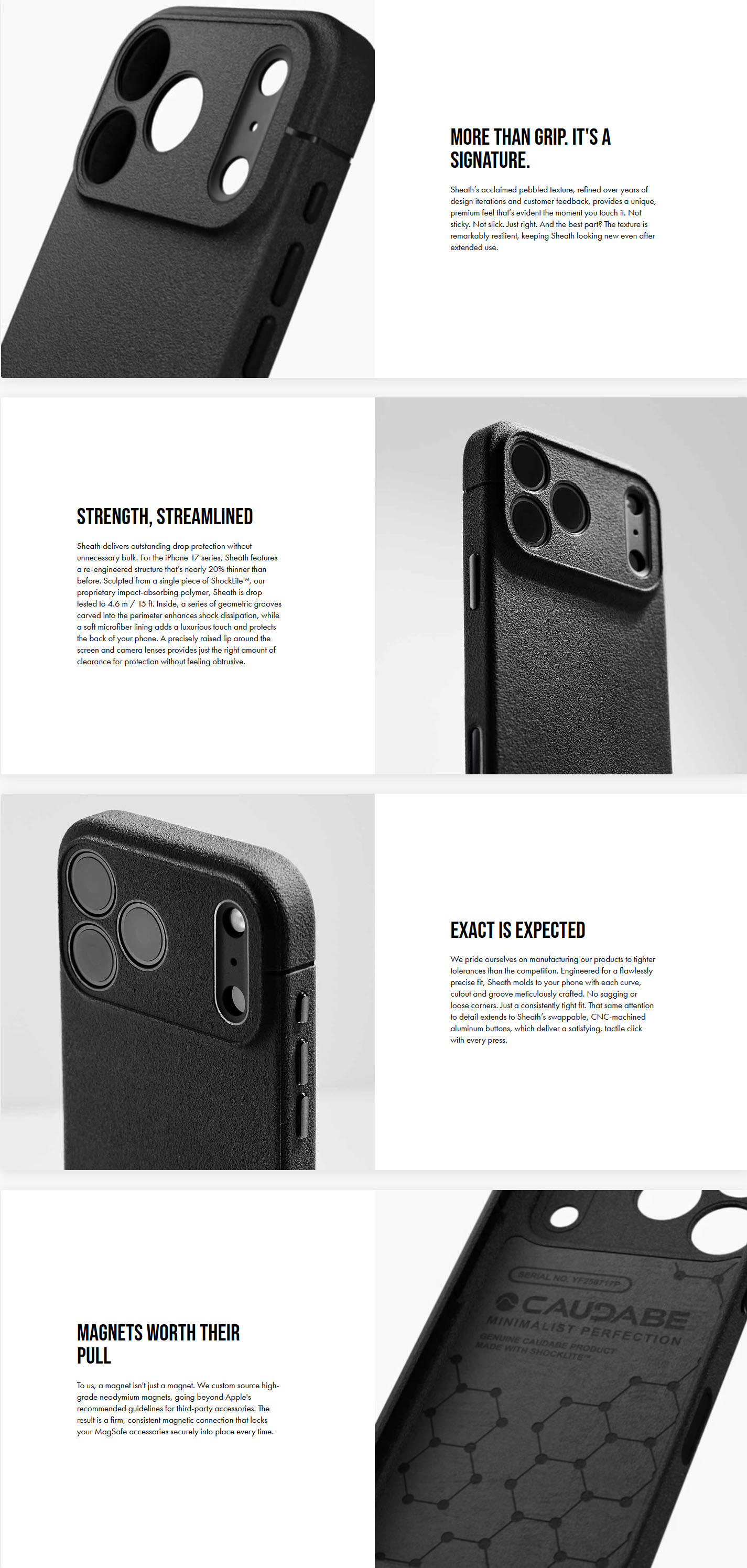 Sheath 提供卓越的防摔保護,同時保持纖薄俐落。針對 iPhone 17 系列全新升級,厚度比前一代減少近 20%。採用一體成型的 ShockLite™ 專利吸震材質 製作,通過 4.6 公尺 / 15 英尺摔落測試。內部邊框設有幾何凹槽,進一步分散衝擊力;柔軟的超細纖維內襯,提供奢華觸感並呵護手機背板。螢幕與鏡頭周圍的精準加高邊框,提供恰到好處的保護,同時不影響操作手感。