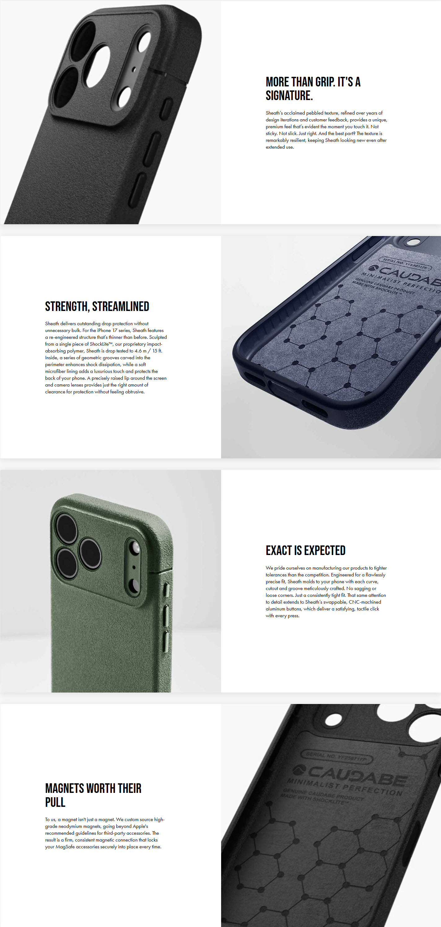 Sheath 提供卓越的防摔保護,同時保持纖薄俐落。針對 iPhone 17 系列全新升級,厚度比前一代減少近 20%。採用一體成型的 ShockLite™ 專利吸震材質 製作,通過 4.6 公尺 / 15 英尺摔落測試。內部邊框設有幾何凹槽,進一步分散衝擊力;柔軟的超細纖維內襯,提供奢華觸感並呵護手機背板。螢幕與鏡頭周圍的精準加高邊框,提供恰到好處的保護,同時不影響操作手感。