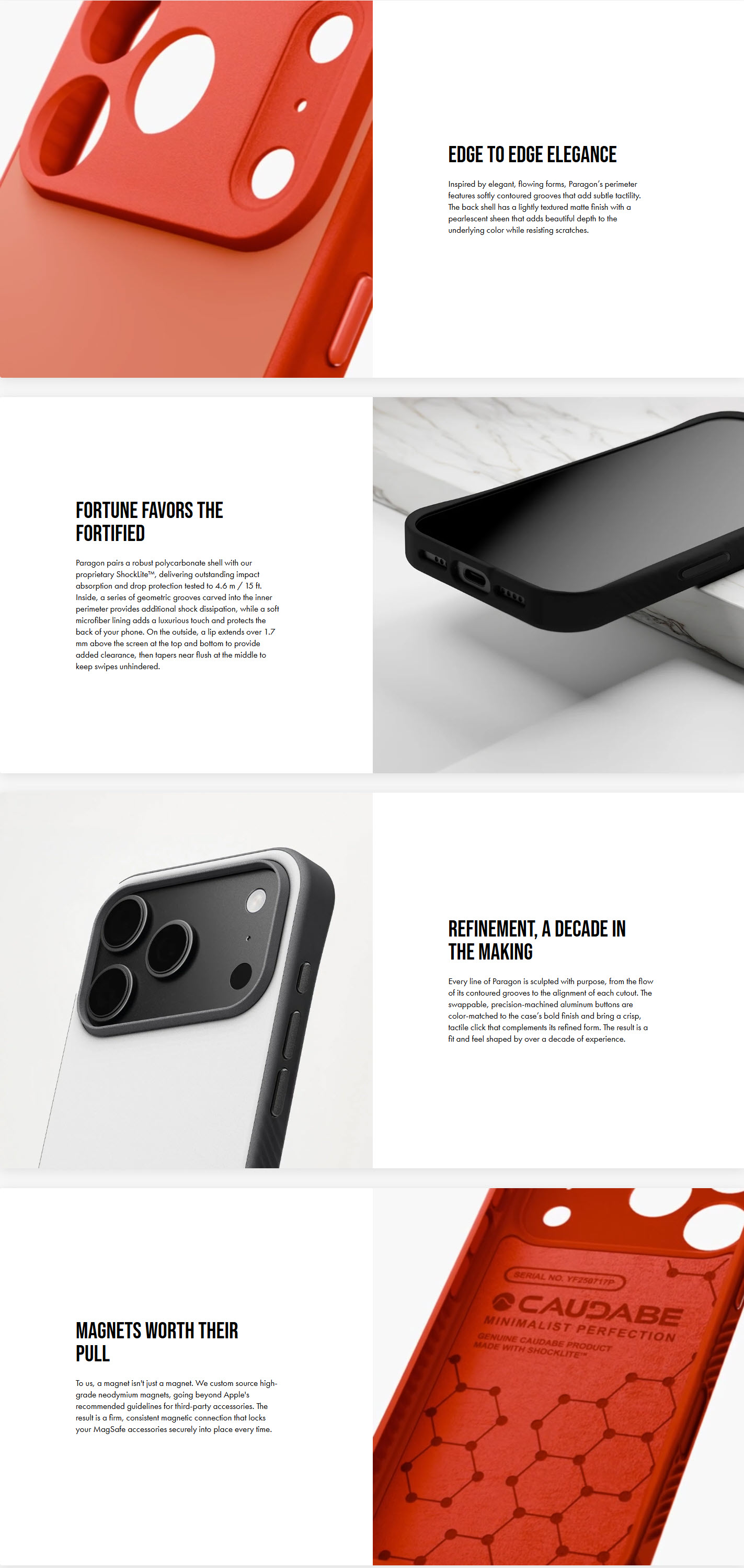 Paragon 將堅固的聚碳酸酯外殼 與專利 ShockLite™ 緩衝材質結合,通過 4.6 公尺 / 15 英尺摔落測試,展現卓越的防護力。內部邊框刻有一系列幾何凹槽,進一步分散衝擊力;內襯則覆有柔軟的超細纖維,增添奢華觸感並保護手機背面。外側的螢幕邊框在上下位置比螢幕高出 1.7 mm 提供額外保護,中間區域則逐漸貼合,確保滑動操作流暢無阻。
