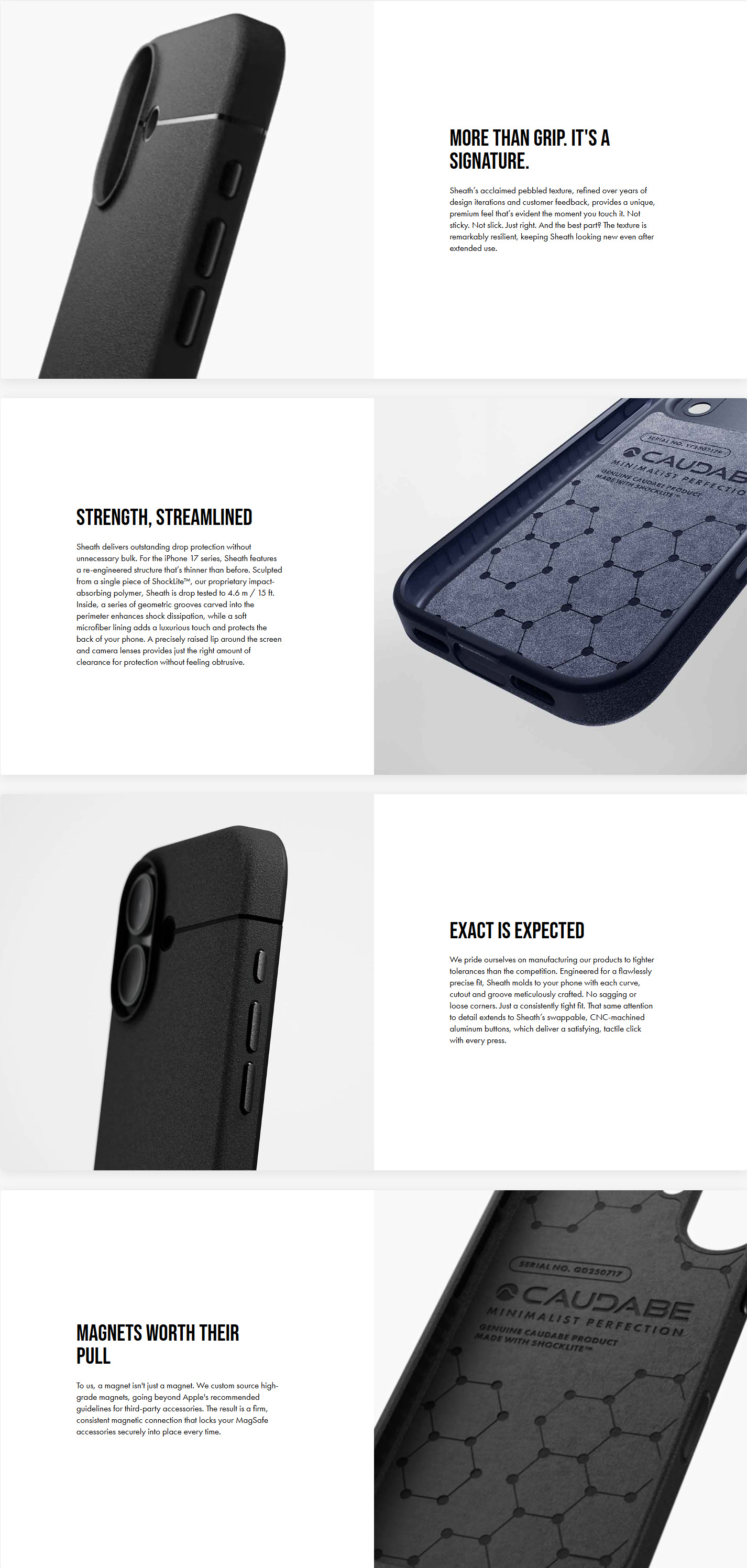 Sheath 提供卓越的防摔保護,同時保持纖薄俐落。針對 iPhone 17 系列全新升級,厚度比前一代減少近 20%。採用一體成型的 ShockLite™ 專利吸震材質 製作,通過 4.6 公尺 / 15 英尺摔落測試。內部邊框設有幾何凹槽,進一步分散衝擊力;柔軟的超細纖維內襯,提供奢華觸感並呵護手機背板。螢幕與鏡頭周圍的精準加高邊框,提供恰到好處的保護,同時不影響操作手感。
