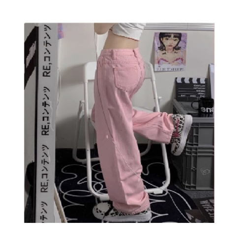 粉紅牛仔直筒褲女春秋季ins高街百搭寬褲高腰寬鬆顯瘦長褲子潮