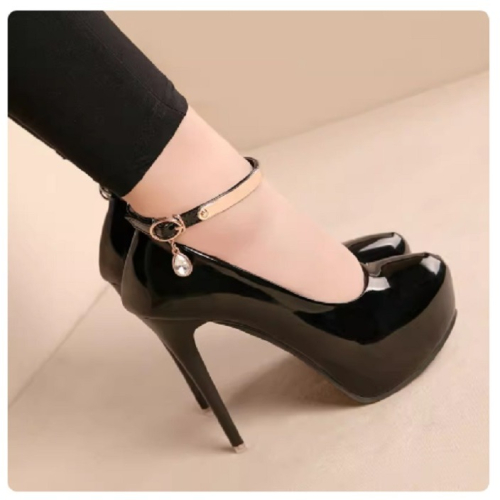新款超高跟12cm高跟鞋一字扣帶單鞋圓頭防水台細跟女鞋黑色 尺碼:38