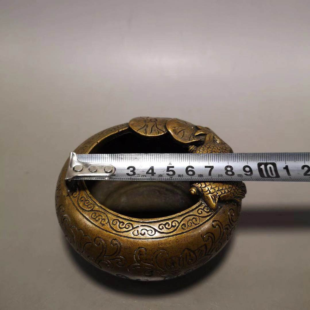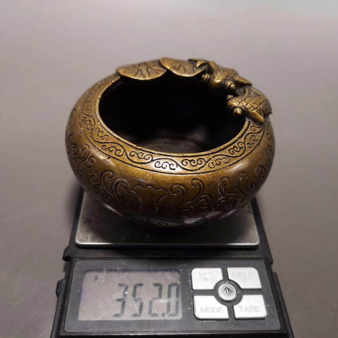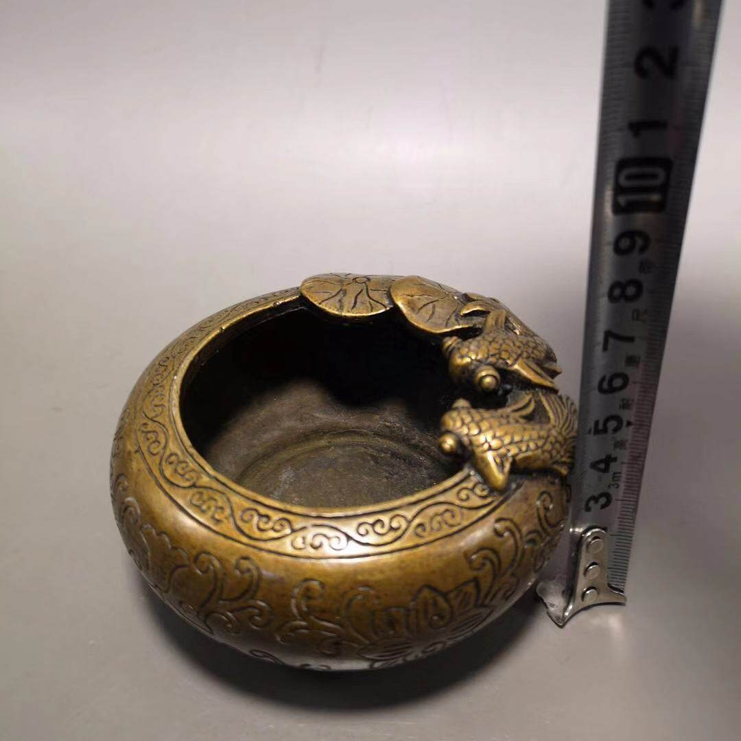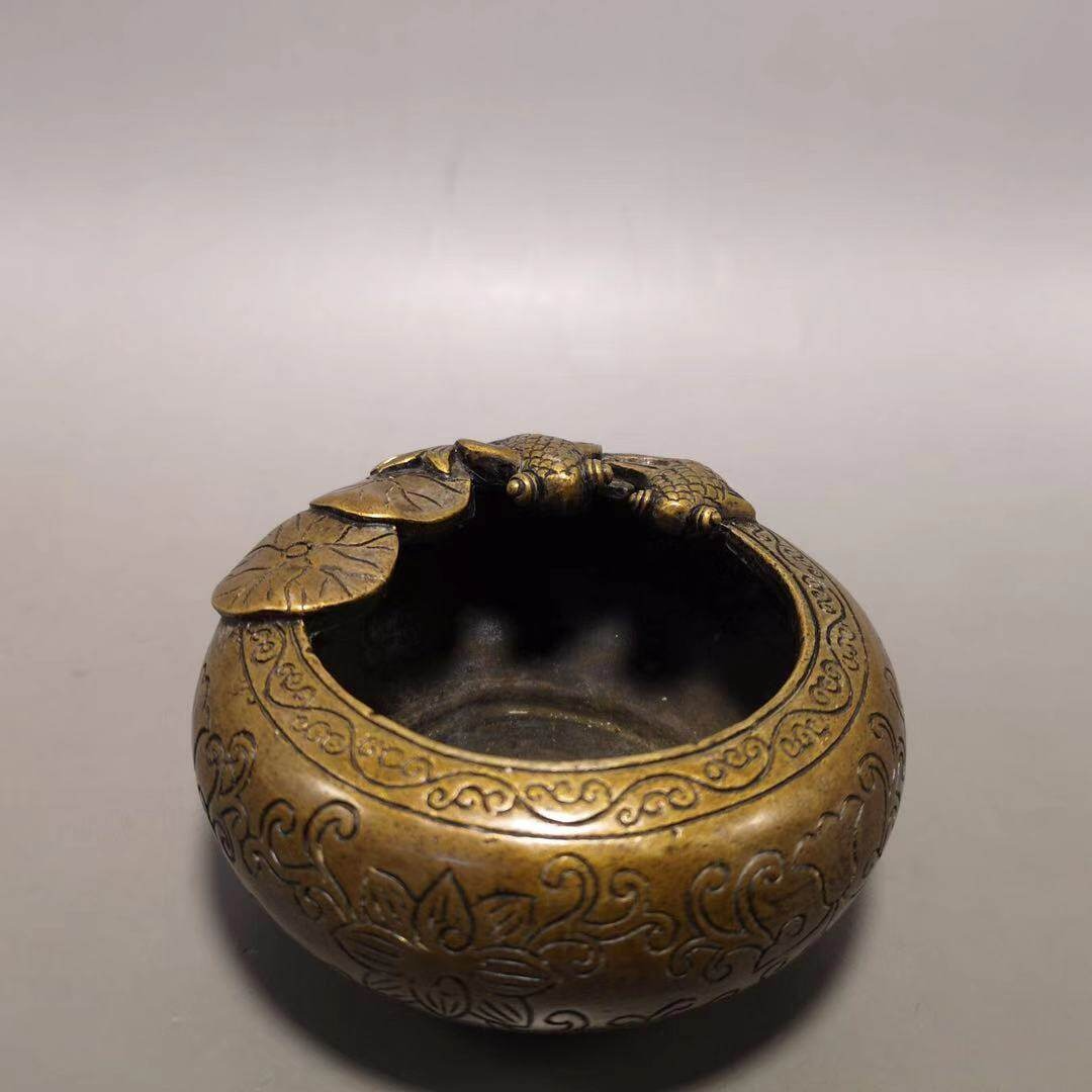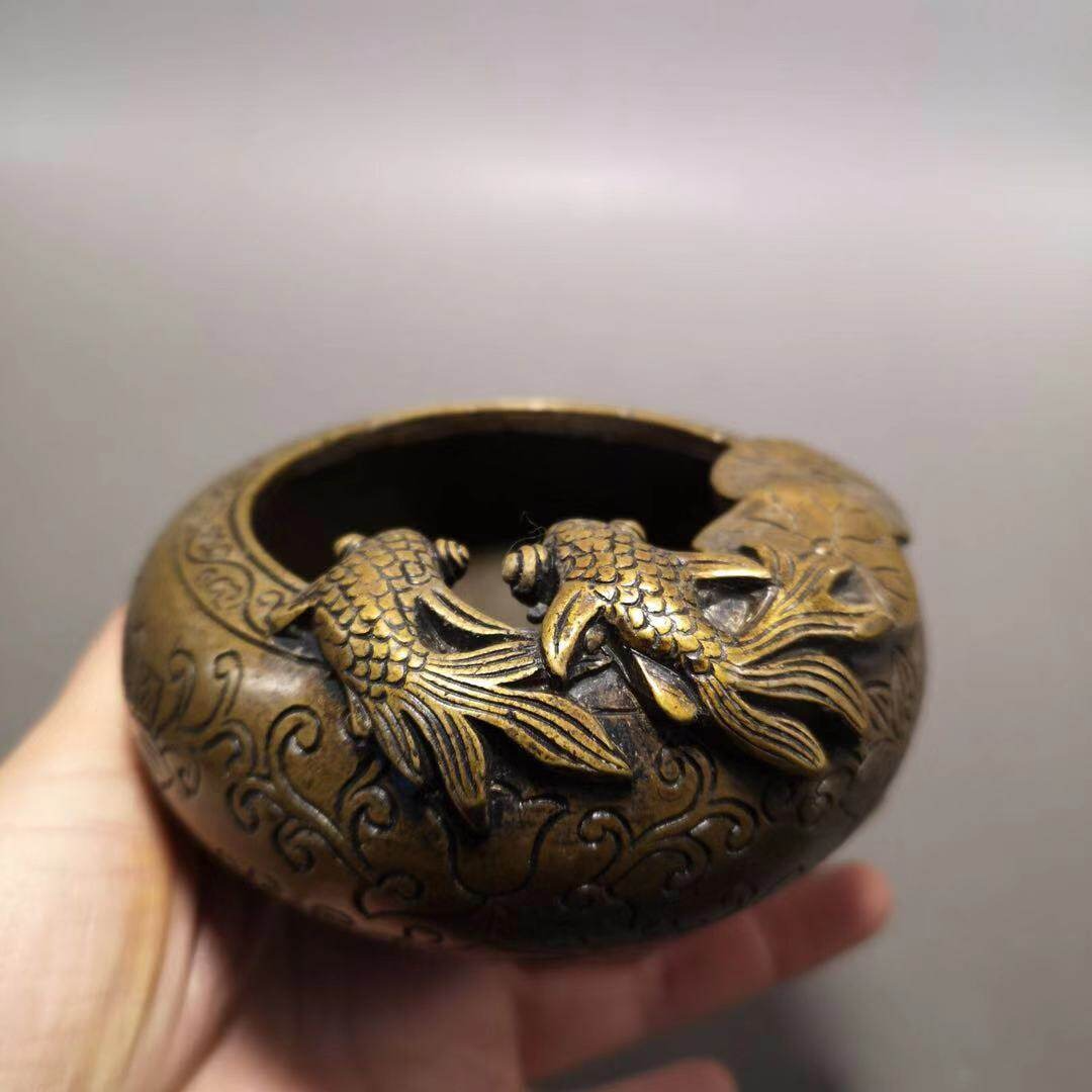 仿古純銅煙灰缸黃銅文房四寶圓形金魚筆洗擺件居家裝飾品