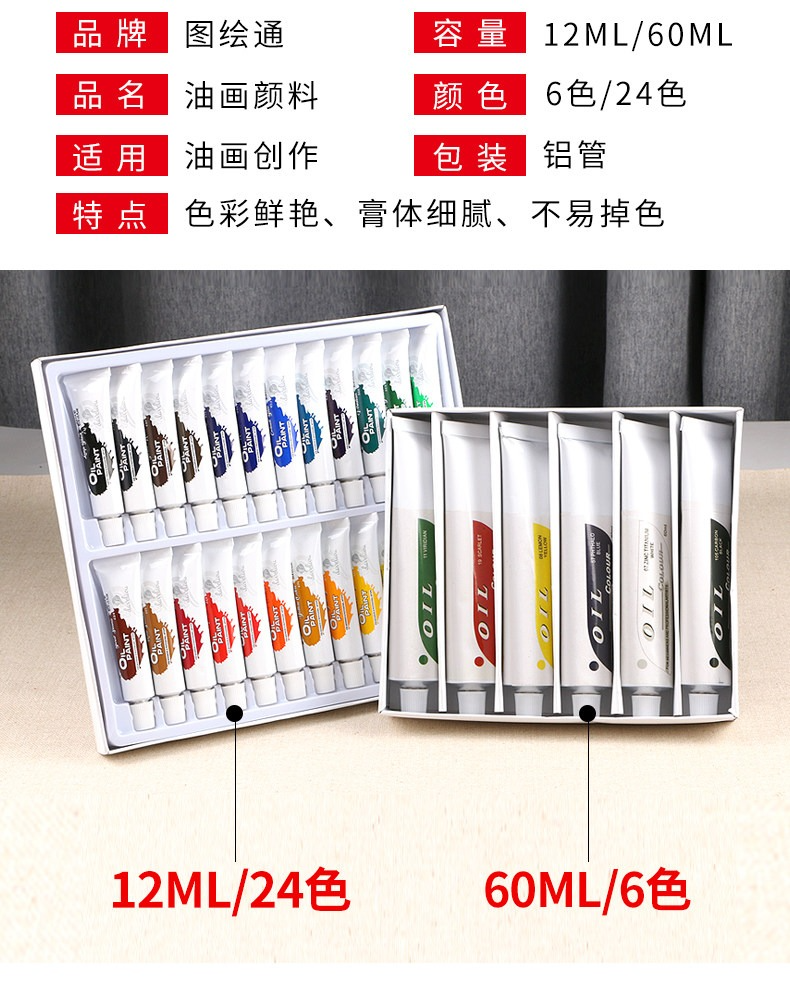 圖繪通油畫顏料套裝初學者6色24色60ml/12ml鋁管美術生專用油彩油墨材料成人兒童