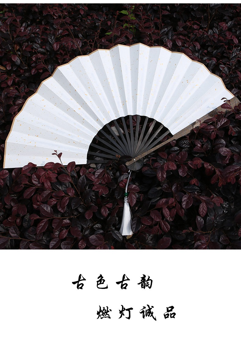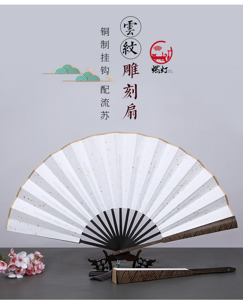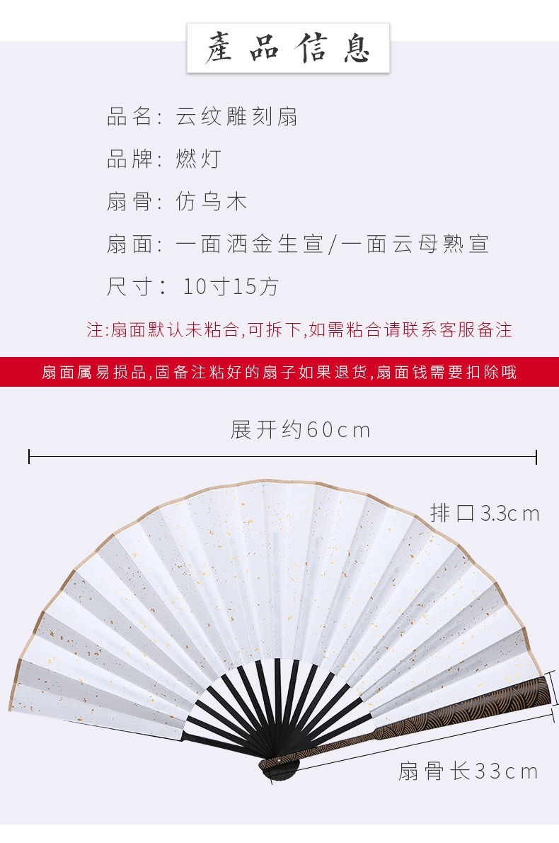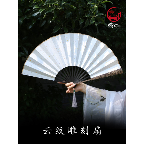 燃燈新品雲紋雕刻扇手工空白灑金絹布宣紙摺扇國潮古風帶流蘇10寸