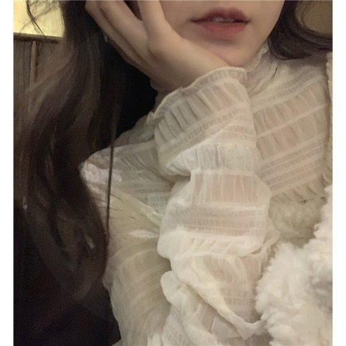 年春秋新款高領蕾絲打底衫女秋冬洋氣短款內搭堆堆領網紗上衣