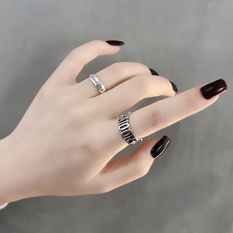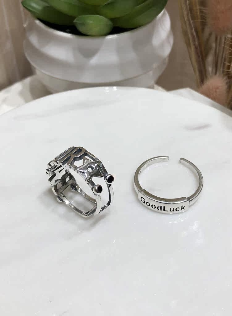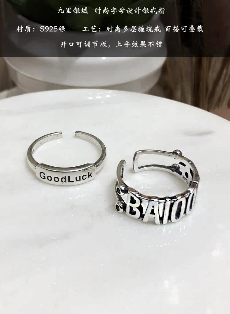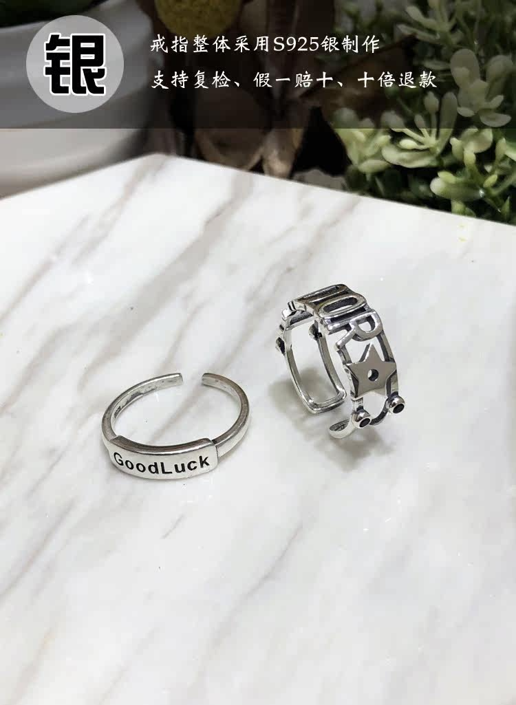 S925銀星星字母戒指百搭GOOD LUCK疊戴個性韓版簡約指環戒子禮物