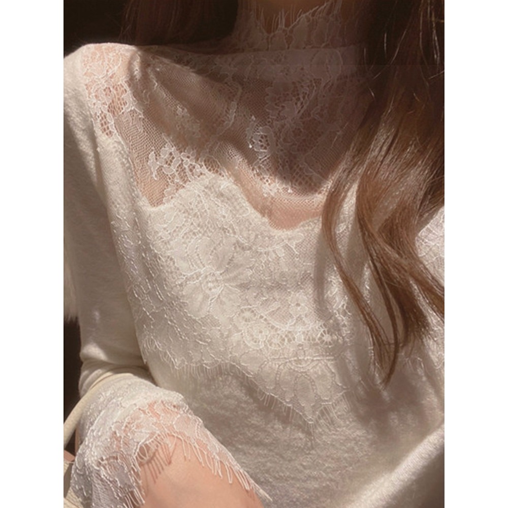 年春秋新款長袖半高領蕾絲打底衫女秋冬洋氣短款內搭網紗上衣