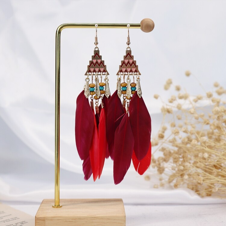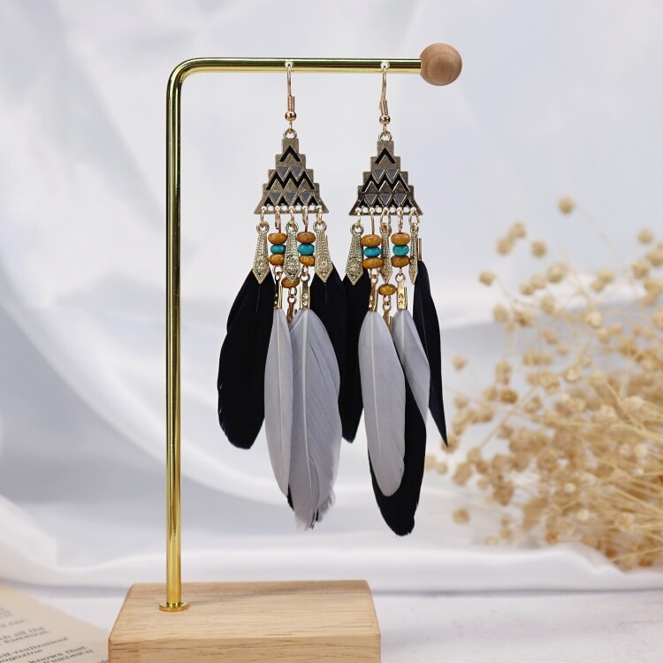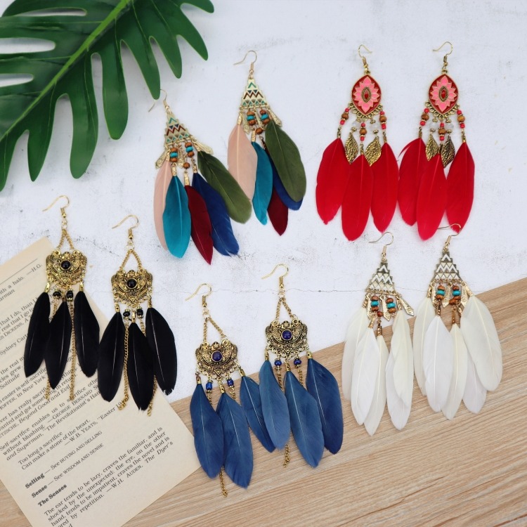 歐美復古印第安風雙色羽毛耳環時尚氣質長款流蘇耳墜波西米亞耳飾