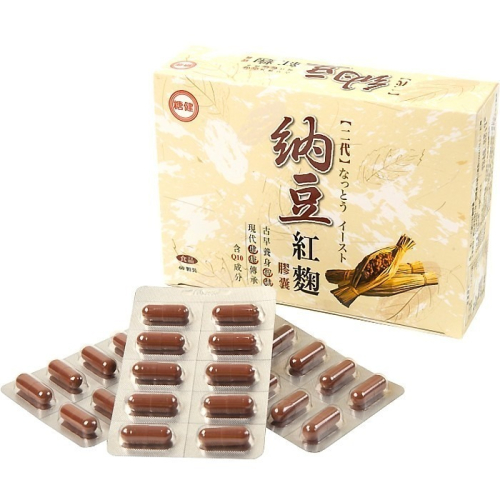 成 分:紅麴粉末、納豆酸酵粉末(麥芽糊精、微結結晶狀 α-纖糖素、納豆菌醱酵物(含納豆激酶))、輔酵素Q10、膠囊(明膠、二氧化鈦、甘油、食用黃色五號、硫酸月桂酯鈉、食用紅色六號、食用藍色一號、純水)
