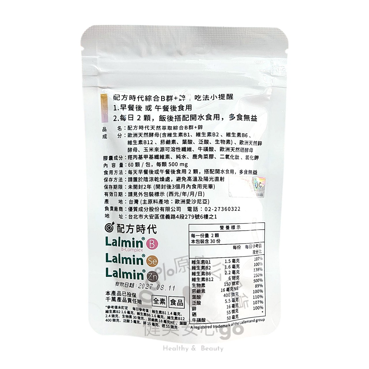 成分:歐洲天然酵母(含維生素B1、維生素B2、維生素B6、維生素B12、菸鹼素、葉酸、泛酸、生物素)、歐洲天然鋅酵母、玉米來源可溶性纖維、牛磺酸、歐洲天然硒酵母