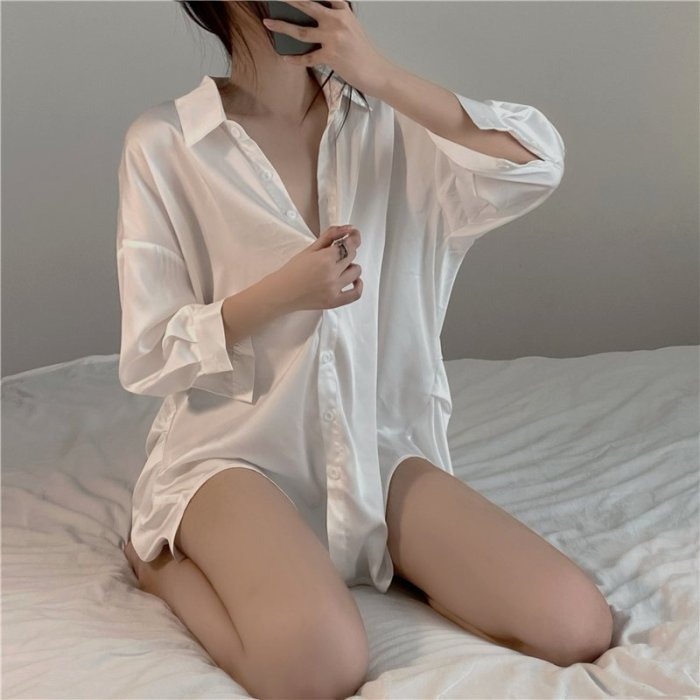 在家也要可可愛愛的 撩男必備戰袍 透膚 慵懶寬鬆 長袖純白男友襯衫家居服 性感睡衣 寬版 素色 白色襯衫睡衣 男友風