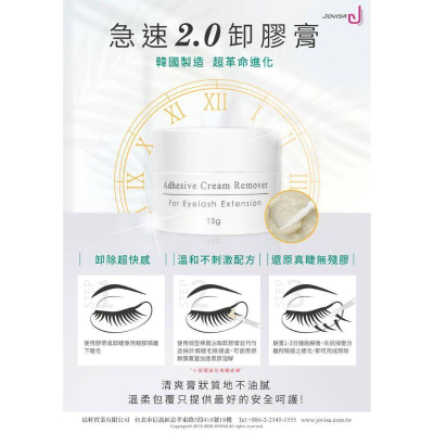 JOVISA邑軒 急速2.0 卸膠膏 容量:15g 產地:韓國 特色:卸除超快感,溫和不刺激配方,還原真睫無殘膠 清爽膏狀質地不油膩,溫柔包覆只提最好的安全呵護