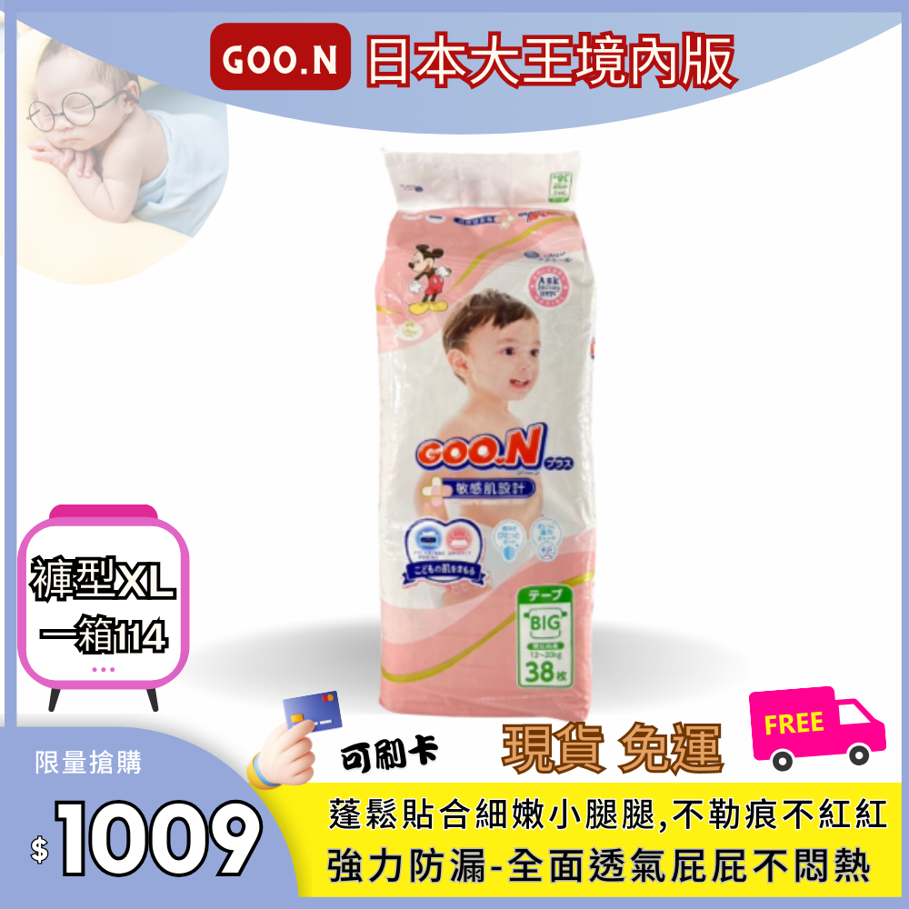 免運現貨☆ GOO.N日本大王【褲型XL號:一箱/3包,38片/包】紙尿布 境內版 肌快適系列 新生兒 嬰幼兒