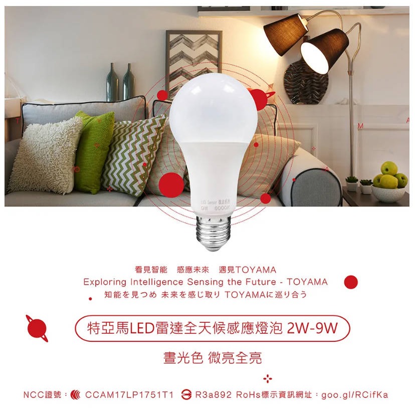 1.TOYAMA特亞馬LED雷達微波感應燈泡壽命長,耗電力少,省電又實惠。