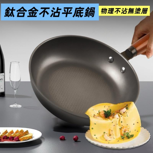 鈦合金0塗層平底鍋鍋。 純鈦平底鍋鍋通常是輕量、耐腐蝕,透過金屬特性達到物理不沾效果。 而鈦合金平底鍋則是結合了鈦的優點(如強度、耐用、無毒)與不沾鍋材質,藉由塗層實現不沾效果。 適合多種爐具,導熱均勻快速,且耐磨、耐刮。