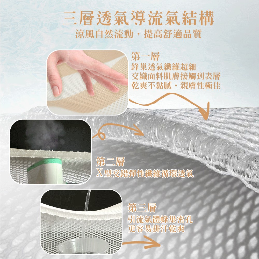 - 3D蜂巢式網布,讓氣流循環散熱,舒爽吸濕排汗