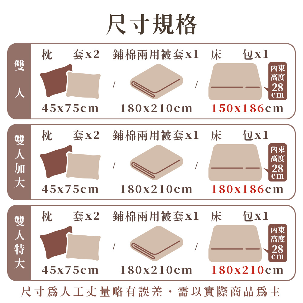雙人規格有四件:床包*1/兩用被套*1/壓框枕套*2