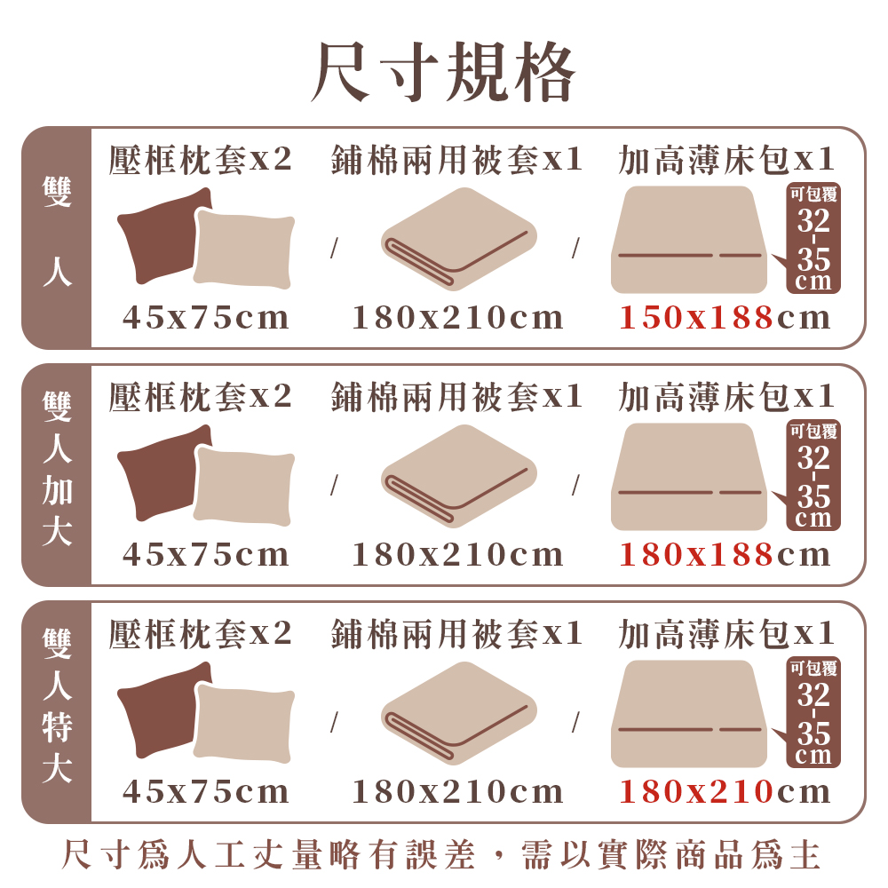 雙人規格有四件:床包*1/兩用被套*1/壓框枕套*2