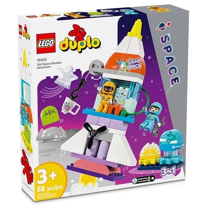 • 可拼砌與重新拼砌的太空船玩具-用玩法多變的樂高® 得寶® 三合一太空梭歷險滿足小小太空人對外太空的熱情,這款火箭玩具適合 3 歲以上學前兒童