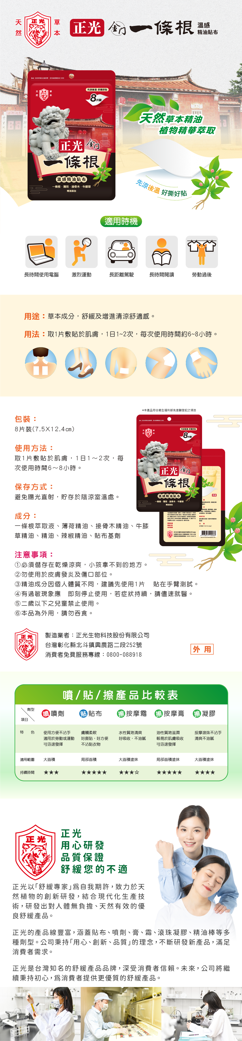 產品成份:一條根萃取液、薄荷精油、接骨木精油、牛膝草精油、薑精油、辣椒精油、貼布基劑