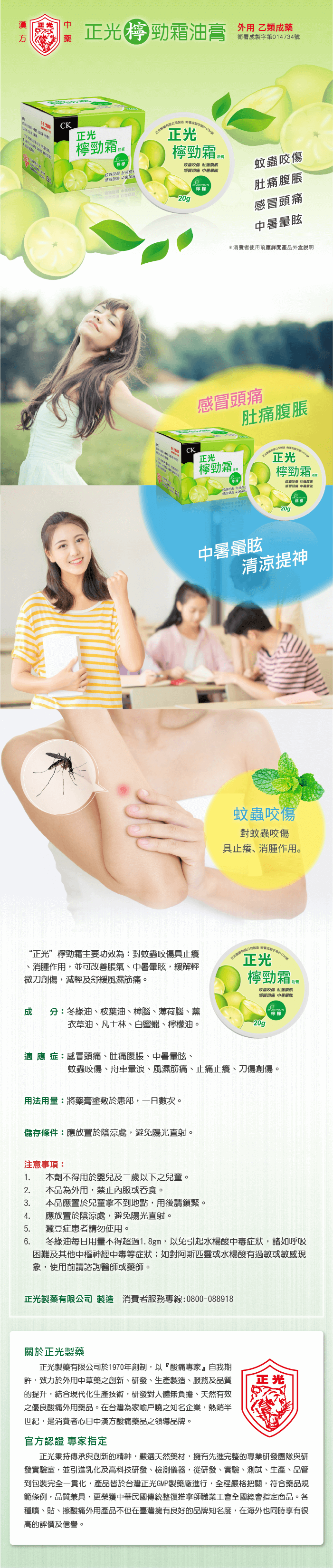 “正光”檸檬勁霜其主要功效為︰對蚊蟲咬傷具止癢、消腫作用,並可改善脹氣、中暑暈眩,緩解輕微刀創傷,減輕及舒緩筋痛。