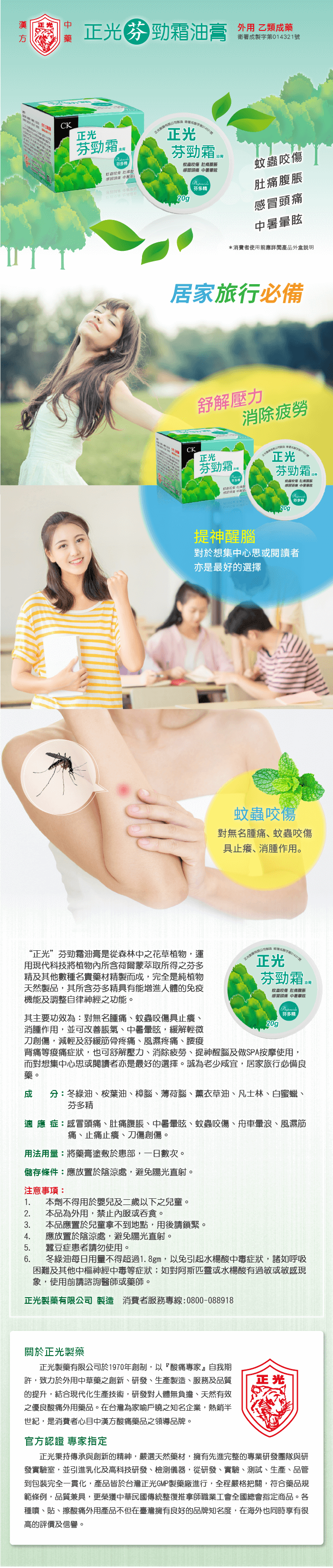 “正光”芬勁霜油膏是從森林中之花草植物,運用現代科技將植物內所含荷爾蒙萃取所得之芬多精及其他數種名貴藥材精製而成,完全是純植物天然製品,其所含芬多精具有能增進人體的免疫機能及調整自律神經之功能。