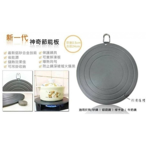所謂節能板是為了瓦斯爐專門出的一塊鋁合金板材,使用的方式為~把節能板直接放在瓦斯爐上,上面再放烹煮的鍋具就可以囉,另外,因為有板子,所以原本鍋底直徑小於爐架的器具也可以在瓦斯爐上烹煮囉
