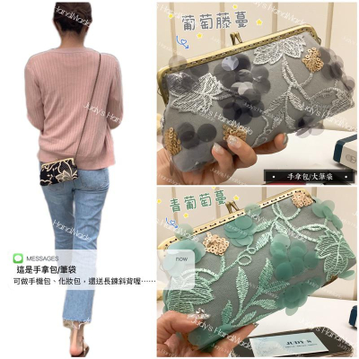 《JUDY’S小舖》 商品名稱:         法式田園風格 葡萄亮片刺繡 手拿包宴會包手機包  化妝筆袋 送鍊條斜肩 現貨 可放手機 送小禮物 實用別緻 👛葡萄藤蔓_材質:双層網紗亮片刺繡 https://s-cf-tw.shopeesz.com/file/tw-11134208-7qukx-leu2ccvkglzbda https://s-cf-tw.shopeesz.com/file/tw-11134208-7quky-leu2ccvkgldb33 👛手拿包/大筆袋 *尺寸:包內高10cm* 寬19.5cm*底厚度5cm (可放一般尺寸手機) +送《120公分 古銅色O字長鍊》可斜肩背背, 敬請把握! *材質:双層網紗亮片刺繡 *用途:可手拿、可肩背、外出簡易小包、放筆放化妝刷⋯手機包、手拿包 宴會包、收納包 化妝包、斜肩包  *閉合方式:(古銅色)扭轉即可開/合 *與眾不同、花色精緻獨特、好搭配實用的網美包 *手工製作、背在身上回頭率高、詢問度高的風格包型 *款式數量花色 皆為少量制作、不易撞包、送人自用皆宜 (不含圖中道具手機) https://s-cf-tw.shopeesz.com/file/tw-11134208-7qul5-lezbbwock4kv6d #青色  #灰色#田園風 #手機包#口金包#手拿包 #收納包#網美包 #斜肩包 #化妝包 #零錢包 #宴會包#斜跨包#筆袋